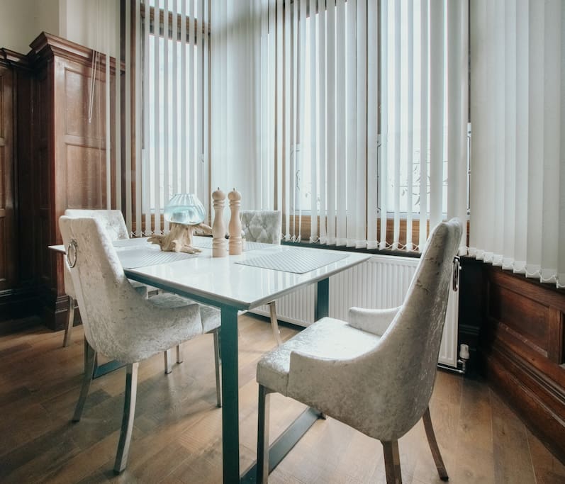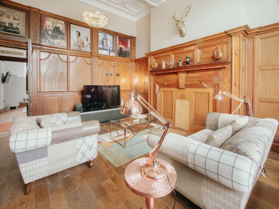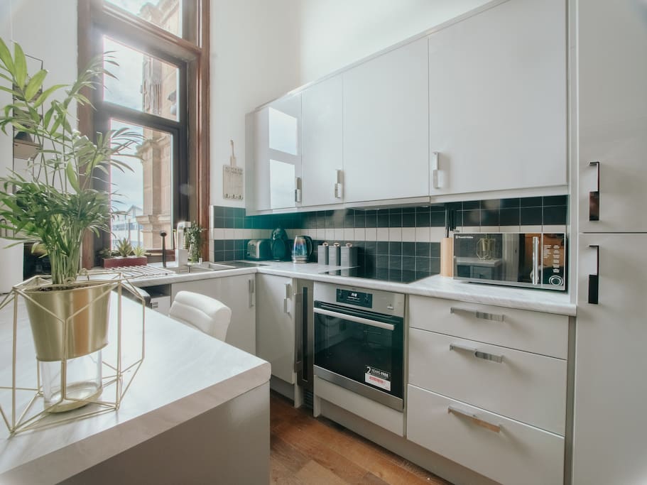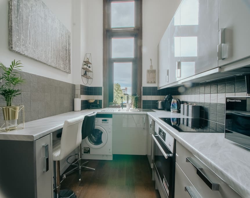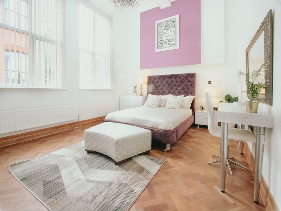 Enjoy the blend of elegant throwback style with a modern twist close to the heart of Sheffield. Discover a space full of soothing white and creme tones, opulent furnishings and decor, and a feel of the historic steel city from within the iconic building. Marvel at the handpicked artifacts in a large living roomand then fall asleep in a heavenly bedroom with a massive king bed and 43" TV within its 8 ft windows and high walls and twinkling lights.