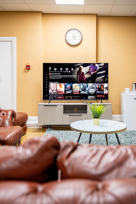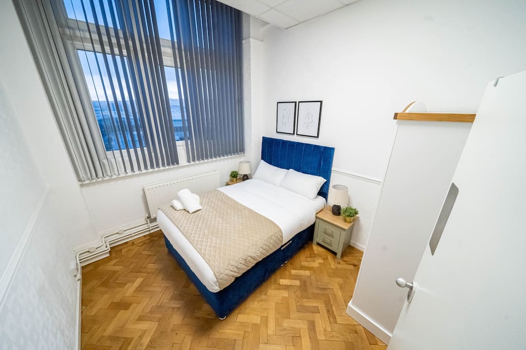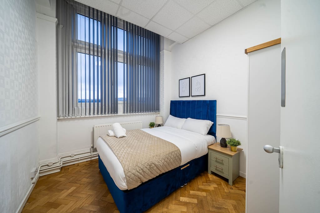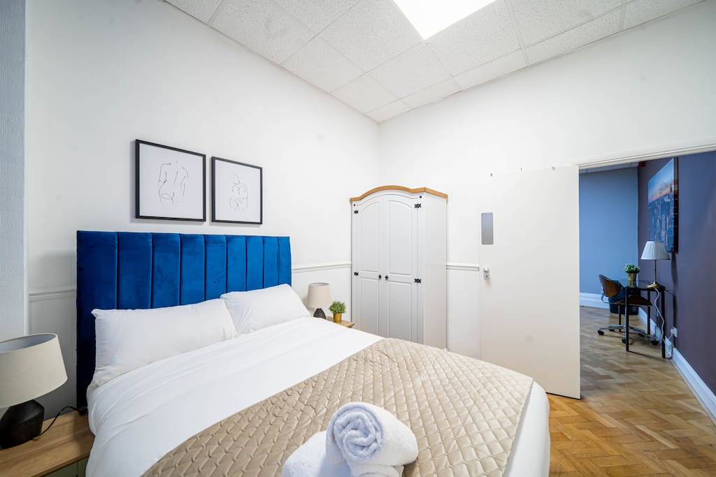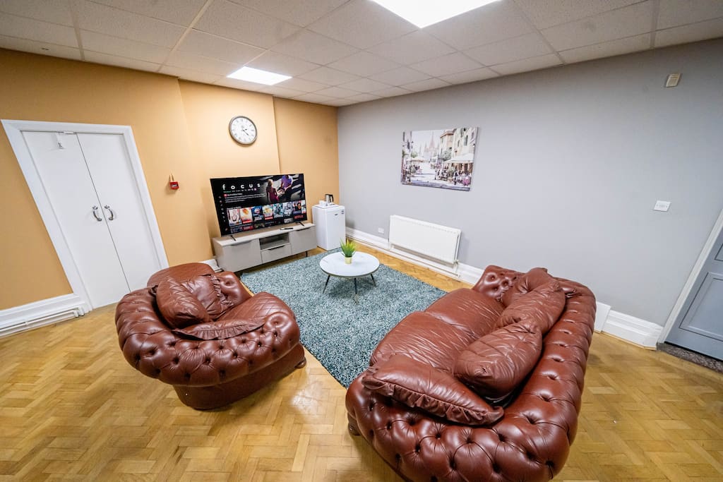 Immerse yourself in huge private bedroom in the historic charm of Bessemer House, featuring a comfy bedroom, expansive living area with a cozy double fold-up bed, and a shared modern bathroom. Indulge in the comfort of leather sofas and a smart TV. Book for a blend of history and comfort. The whole group will enjoy easy access to everything from this centrally located place.