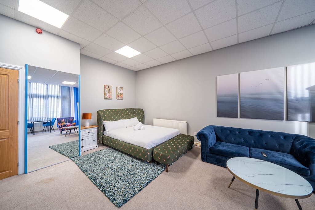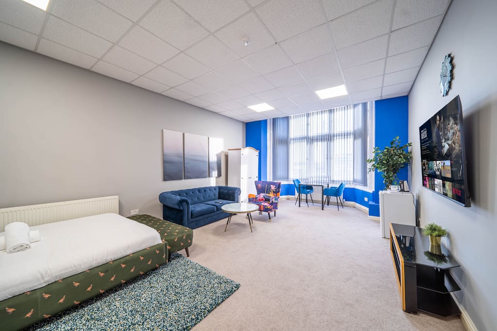 Stay cheap and cheerful with the whole family or a work colleague at this great place with lots of room for fun. The extra large room is delightfully furnished above standard with a massive king-size bed and a sofa bed that can sleep additional guest. Natural light pours in through the large windows, highlighting the vibrant blue accents that complement the room’s neutral palette It is equipped with a massive 65" TV for close up entertainment.