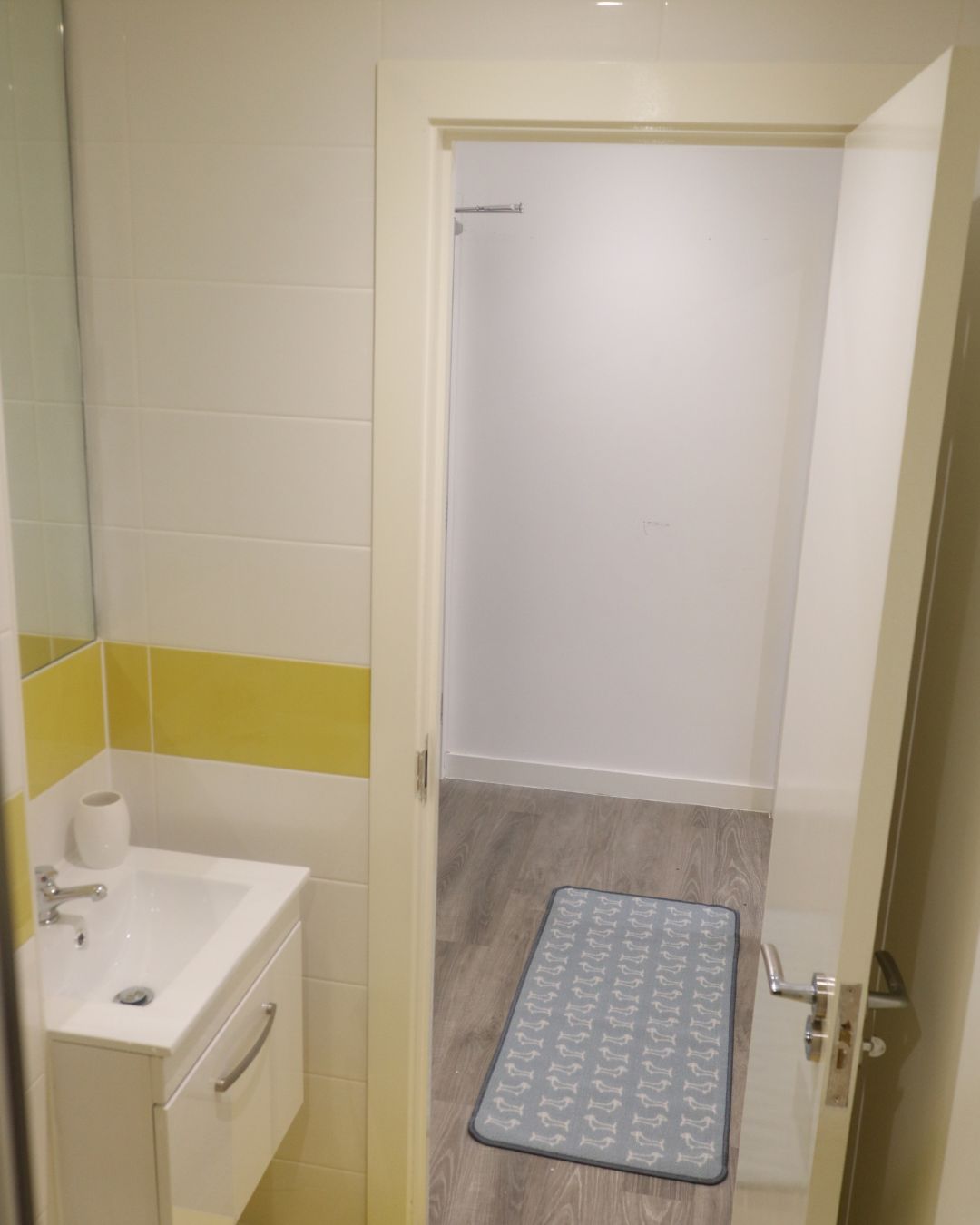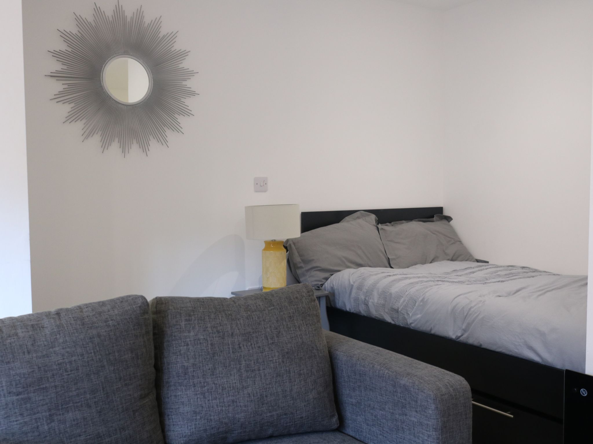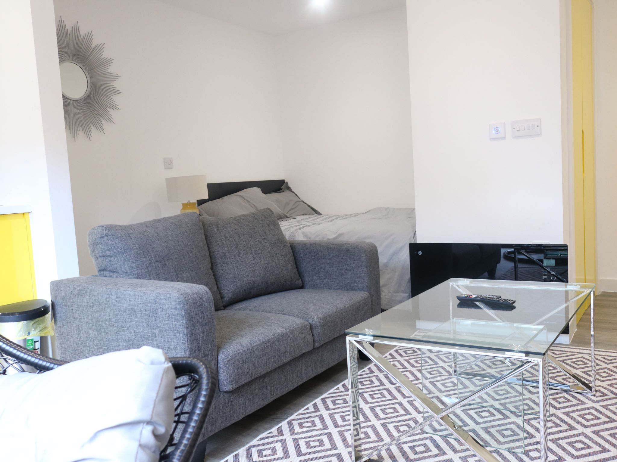 The fully equipped kitchenette offers a microwave, fridge, kettle, and all the essentials for cooking or snacking. The bathroom is clean and modern, with bright yellow tiling and a walk-in shower. Floor-to-ceiling windows invite in plenty of natural light, making the studio feel open and airy. Ideal for solo travellers, couples, or business guests looking for a cheerful, well-connected base in Sheffield.